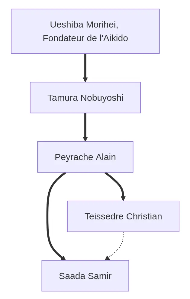 Sensei Samir Saada étudia l'Aikido auprès de Sensei Christian Teissedre, puis en tant qu'élève de Sensei Alain Peyrache qui fut élève de Sensei Nobuyoshi Tamura.